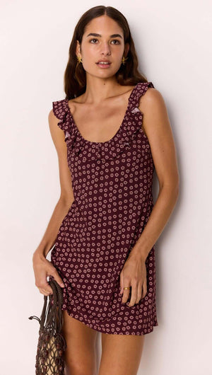 Ruffle Strap Low-Back Mini Dress in Burgundy Floral Print