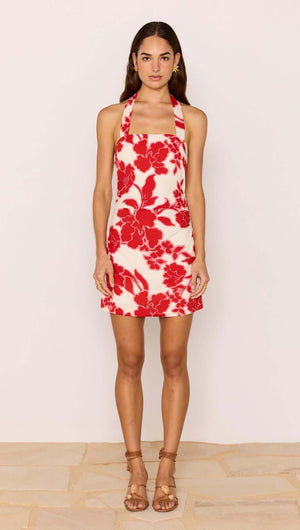 Red & White Floral Linen Blend Halter-Neck Mini Dress